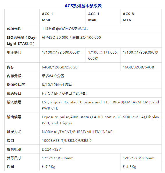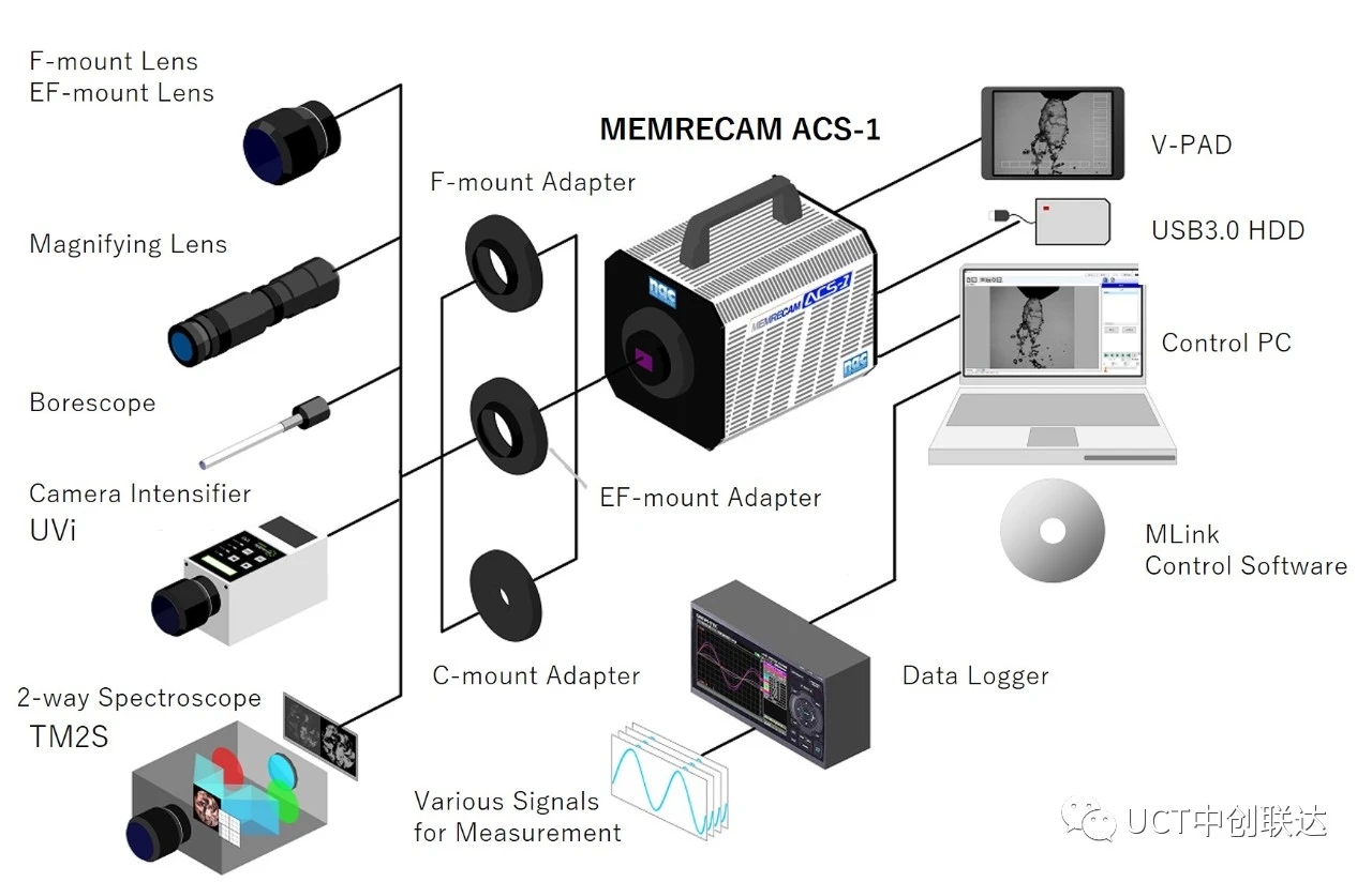 ? ? ? ?2018年日本nac Image Technology公司針對1280×896(1.14M Pixel)像素級的高速攝像機推出了ACS系列,2020年又將ACS系列進行整體升級,推出了市場上首款拍攝速度達到10萬fps(百萬像素下)的Memrecam ACS-1 M60。ACS-1 M60采用適配性超高的1280×896 CMOS傳感器,滿幅拍攝速率可達到60,000幀/秒(彩色芯片)100,000幀/秒(黑白芯片);超高的拍攝速率可達到1,000,000幀/秒(標準版);具有超高感光度(ISO-Daylight SAT):100,000(黑白)/20,000(彩色)。納秒級的時間精度,使其具有更高的幀速率、幀同步及曝光精度;500ns的跨幀模式曝光時間間隔,使其可完全滿足PIV/PTV/LIF/DIC等非接觸式測量應用的需要,無圖像滯后;另有超大內(nèi)部存儲器1TB可選配;可連接模擬和數(shù)字監(jiān)視器實時顯示拍攝圖像,通過觸屏或JPAD控制器進行控制攝像機,無需將其與PC連接,可適用于各種需要考慮環(huán)境條件的應用;與PC連接時,還可通過專用的USB3.0線纜進行數(shù)據(jù)的高速下載存儲,速度遠高于傳統(tǒng)的千兆網(wǎng)線。